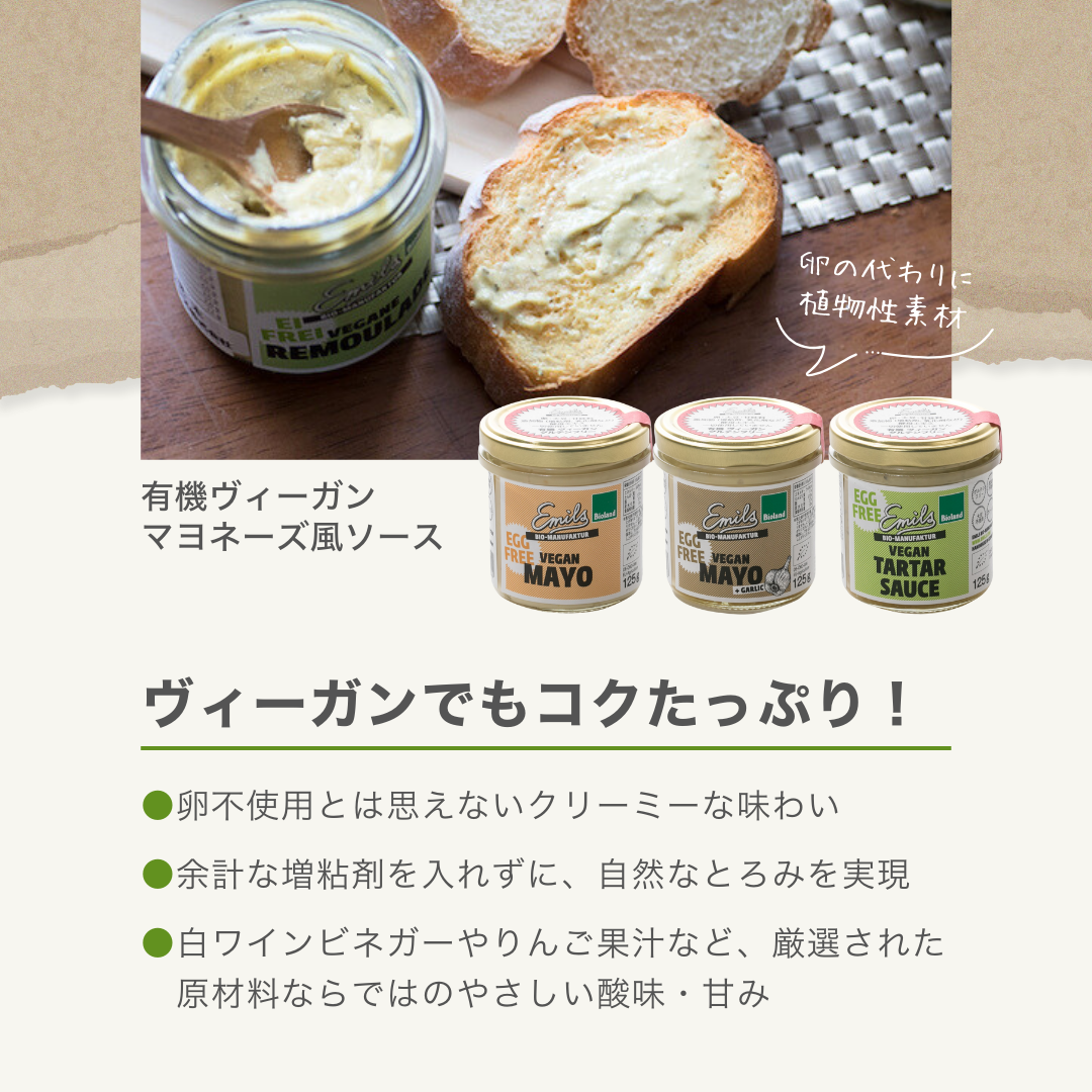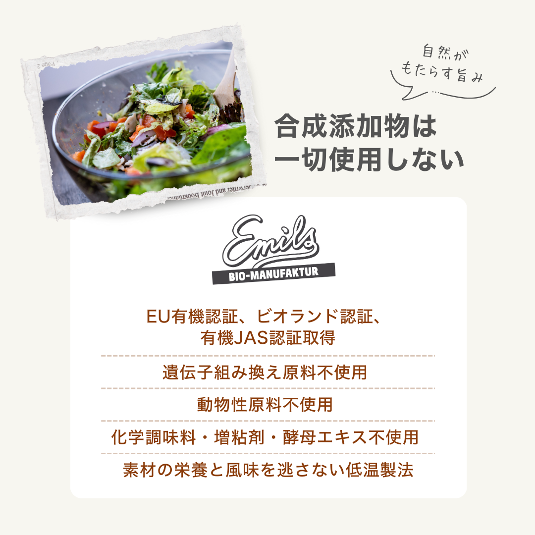 | 原材料名 | 有機菜種油、有機濃縮還元リンゴ果汁、有機アーモンド、有機白ワインビネガー、有機マスタード(有機カラシナ種子、有機リンゴ酢、岩塩)、海塩、(一部にりんご・アーモンドを含む) |